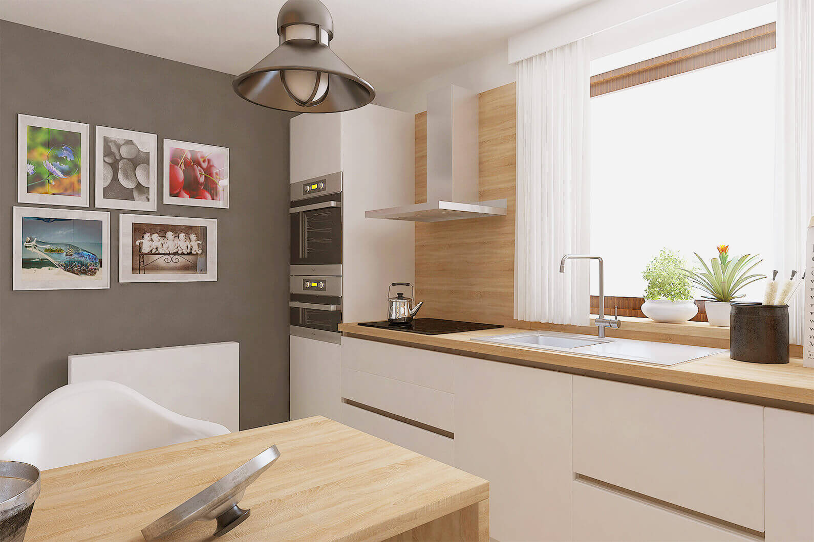 Combinatia de alb uni si textura lemnoasa creeaza un contrast fin cu peretii gri, electrocasnicele si plinta cromata.