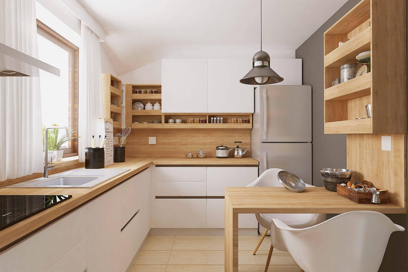 Bucatarie cu design minimalist, imbinat cu nuante calde, care dau incaperii un aer linistit, relaxant.